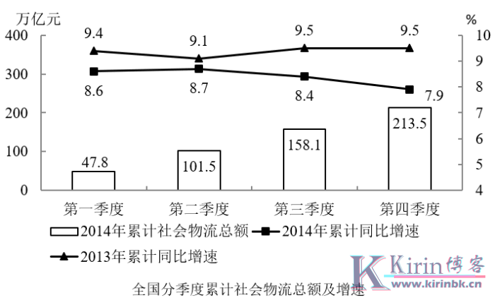 2014 年全国社会物流总额 213.5 万亿元,同比增长7.9%,比上年回落1.6个百分点。2014 年全国社会物流总费用10.6万亿元,同比增长6.9%,其中,运输费用 5.6万亿元,同比增长 6.6%;保管费用3.7万亿元,同比增长7.0%;管理费用 1.3 万亿元,同比增长 7.9%