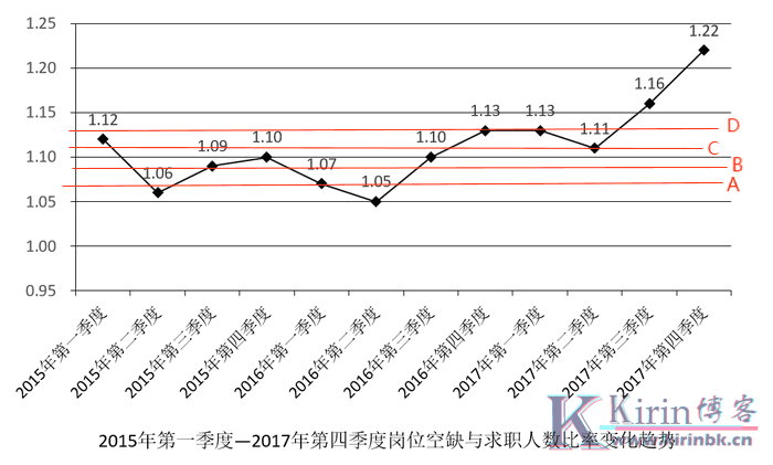 问:2015-2017年,各季度的岗位空缺与求职人数比率的平均值约为()