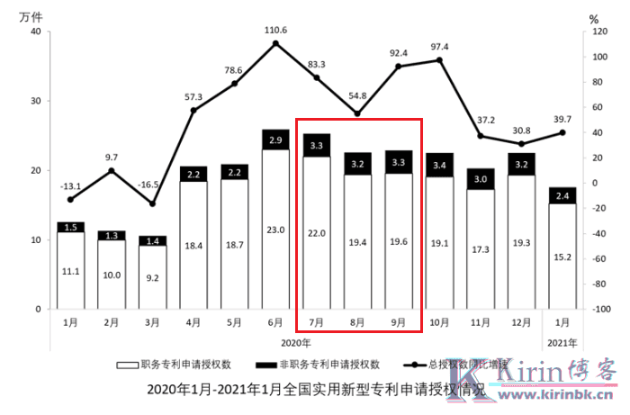 问:以下折线图中,最能准确反映2020第三季度各月全国实用新型专利申请总授权数中非职务专利申请授权数占比变化趋势的是()