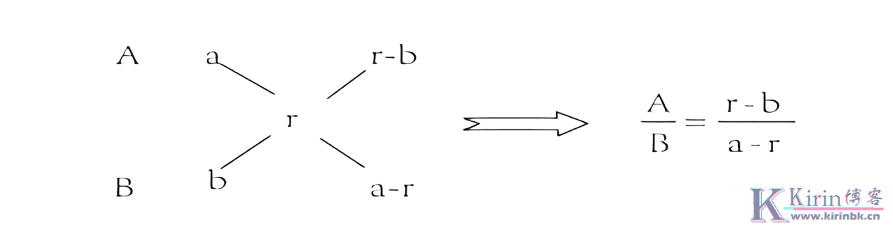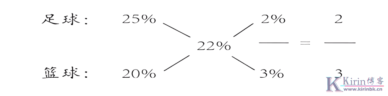 3、口诀:整体写中间,部分写左边(大的在上,小的在下),交叉做差,得到分母之比。