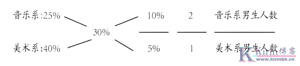 例2:(2016联考)某高校艺术学院分音乐系和美术系两个系别,已知学院男生人数占人数的 30%,且音乐系男女生人数之比为 1:3,美术系男女生人数之比为 2:3,问音乐系和美术系的总人数之比为多少?