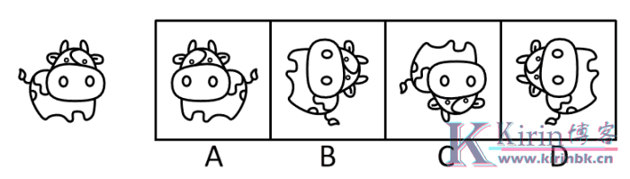 C项:选项图形与左图不一致,选项缺少一个牛角,不能由左图得到,当选;