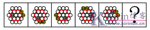 ※解析:元素组成相同,优先考虑位置规律。观察发现,题干图形内圈和外圈的黑球数量均相同,优先内外分开看。如下图所示,标记为①的黑球在内圈每次逆时针移动一格,标记为②③的黑球在外圈每次顺时针移动三格,只有C项符合规律。故正确答案为C。