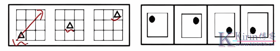 ※解析:元素组成相同,优先考虑位置规律。1号黑球沿着对角线向右下方循环移动,每次移动1格(循环移动);2号黑球沿图形外圈移动,每次顺时针移动1格。故1号黑球应该移动到第2行第2列的位置,2号黑球应该移动到第4行第2列的位置。只有A项符合。 故正确答案为A。